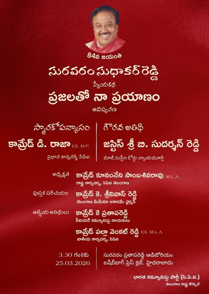 బుధవారం మార్చి 25వ తేదీన పార్లమెంట్ మాజీ సభ్యులు సురవరం సుధాకర రెడ్డి స్వీయకథ ఆవిష్కరణ.